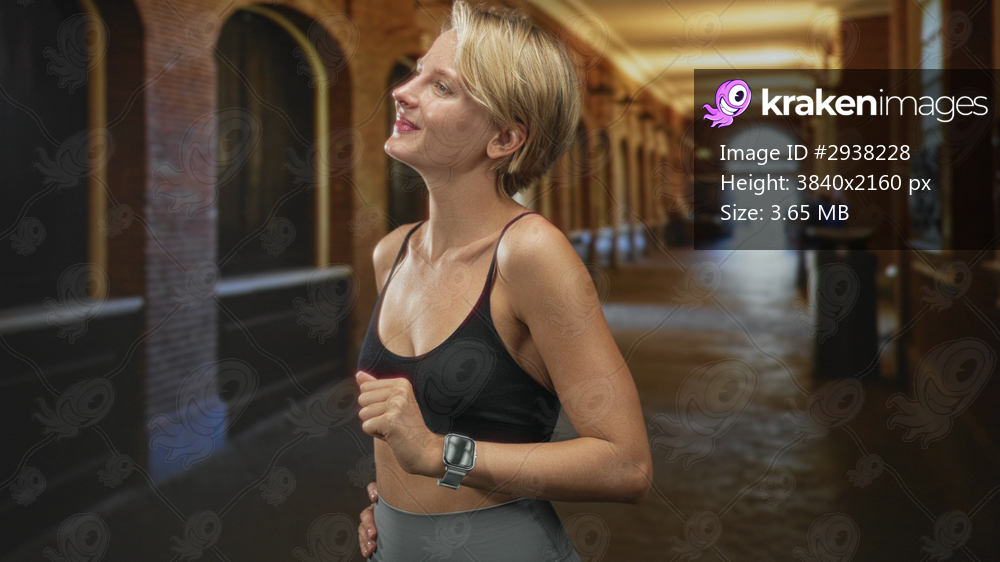 Blond woman jogging with smartwatch and exposed shoulders in a brick arcade building; calm wellbeing focus.