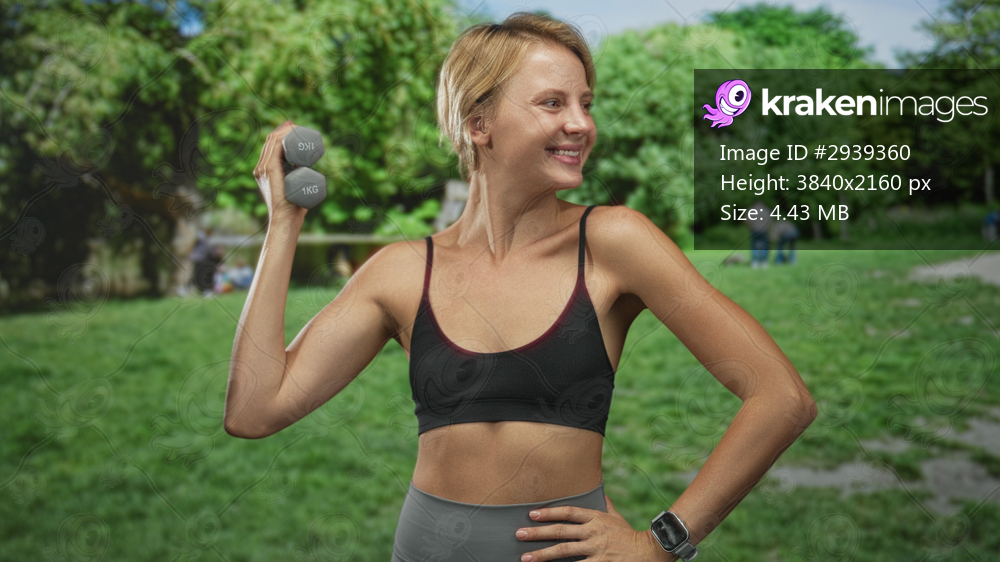 Blond woman lifts dumbbell with bent arm showing bicep in park, smiling and holding weights to chest; wellness joy.