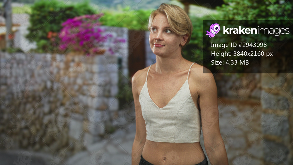 Blond woman showing navel and open palms shrug gesture on a sunlit stone street with a stone wall and pink bougainvillea; calm contemplation.