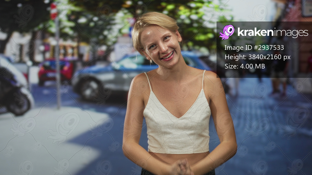Blond woman smiling with palms pressed together and exposed midriff on a busy urban street with cars and pedestrians; joy grace.