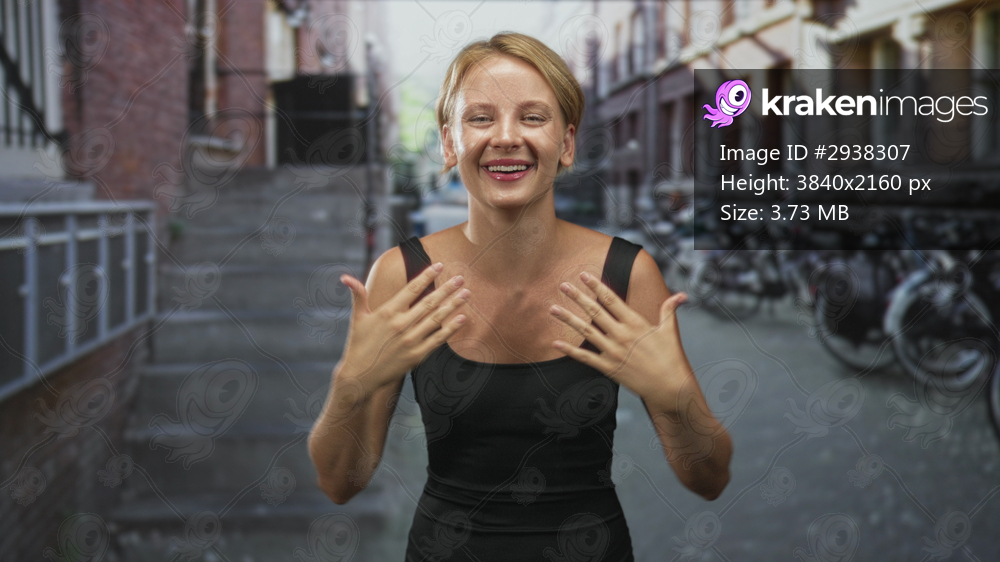 Blond woman touching chest with both hands showing bare shoulders on street lined with bicycles; joyful confidence.