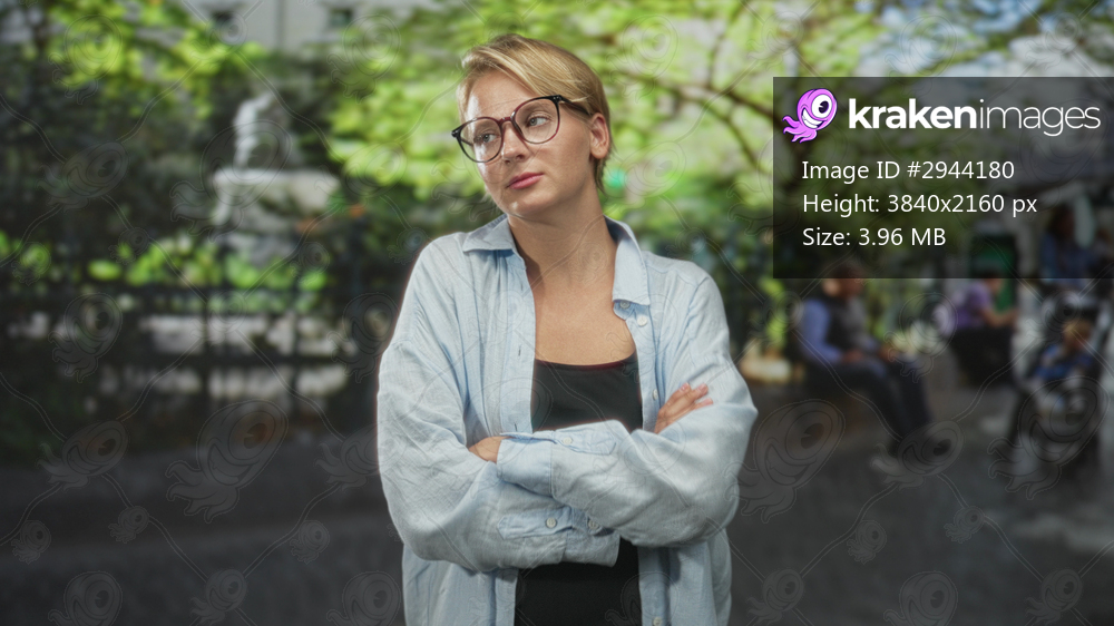 Blond woman wearing glasses gestures with open palms and slightly tilted head while standing on a street near a fountain; pensive reflection.