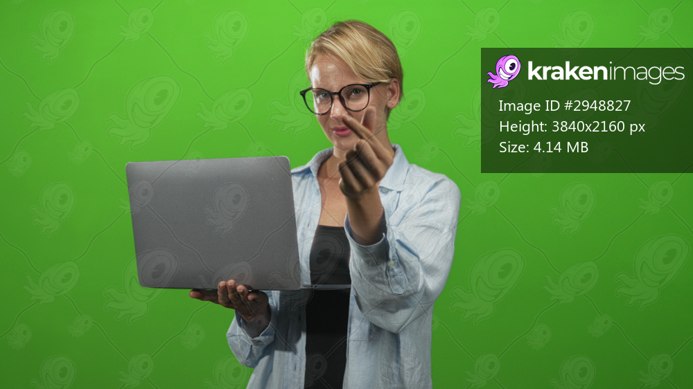 Blond woman wearing glasses holding laptop makes finger heart and puckers lips against green screen in studio; affection playful.