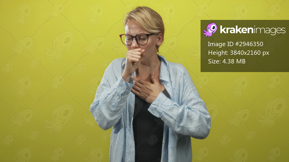 Blond woman wearing glasses and light blue shirt coughing into fist with hand on chest in studio against yellow backdrop; illness discomfort.