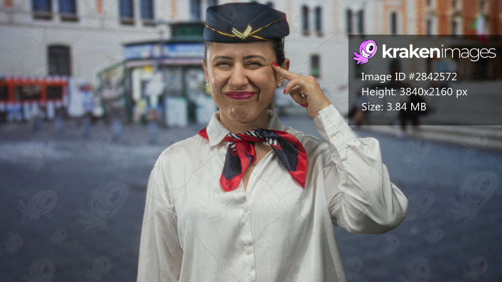 Blonde air hostess wearing red scarf and navy hat touches head with finger on busy street; thoughtful doubt.
