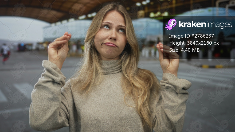 Blonde caucasian woman with bare hands making gossip gesture at airport terminal; sarcasm skepticism.