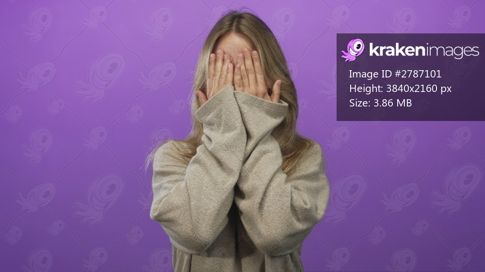 Blonde caucasian woman covers her face with both hands in a photo studio setting; shyness playfulness.