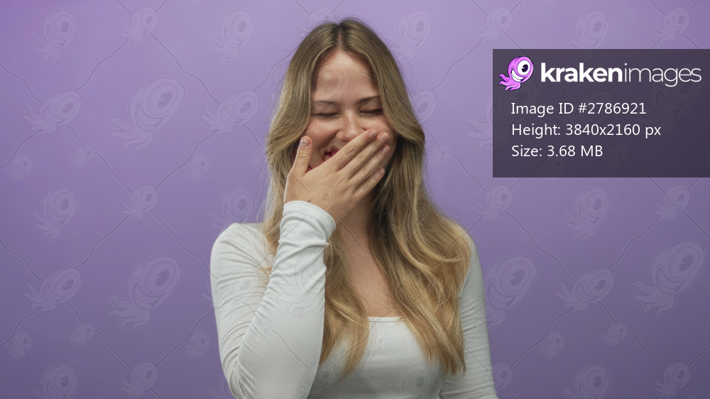 Blonde caucasian woman hand covering mouth laughing in lavender studio portrait; joy amusement surprise.