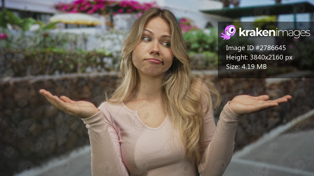 Blonde caucasian woman holds both palms up on street with stone wall backdrop; uncertainty doubt indecision confusion.