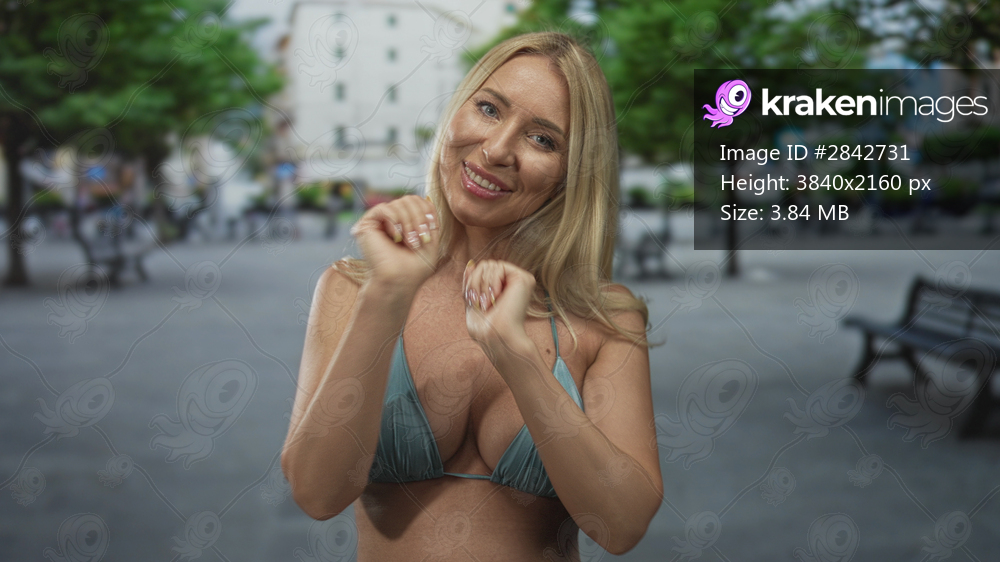 Blonde caucasian woman in blue bikini top places hand on chest on a bustling tree lined city street under summer sunlight; gratitude.