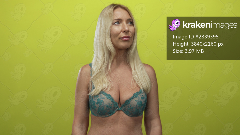 Blonde caucasian woman in teal lace bra revealing cleavage while standing and facing camera in green studio; confidence.