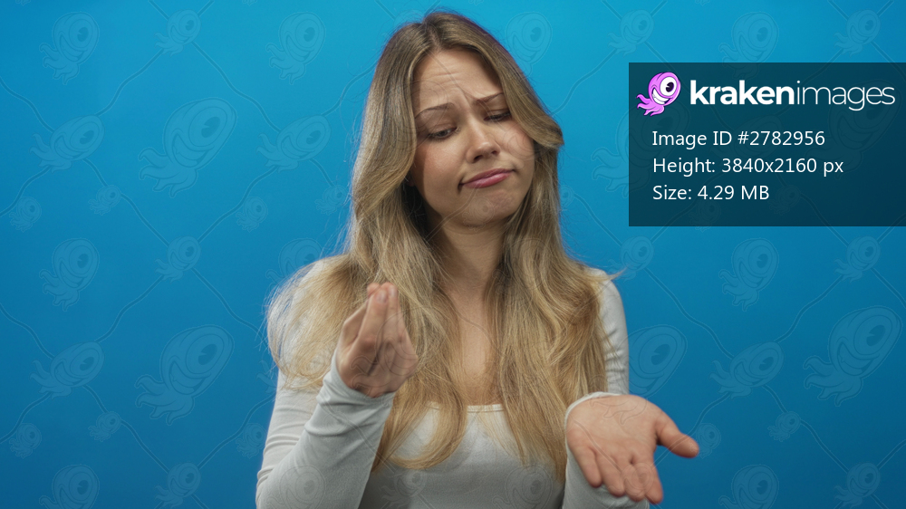 Blonde caucasian woman with open palms asking for money in blue studio; desperation plea need compassion.