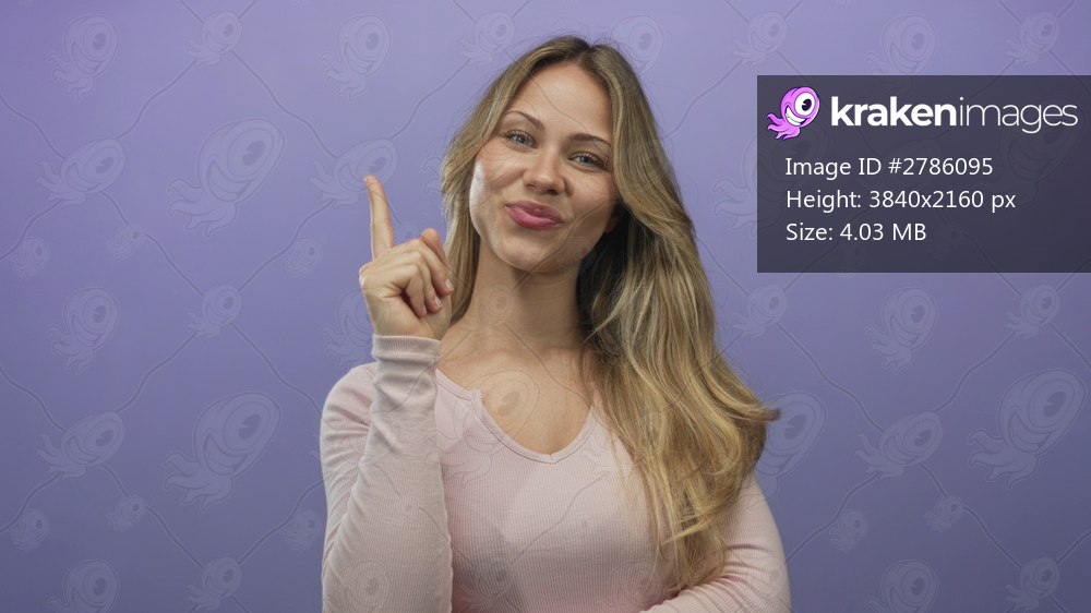 Blonde caucasian woman smiling finger pointing upward in studio; thinking curiosity focus attentiveness.