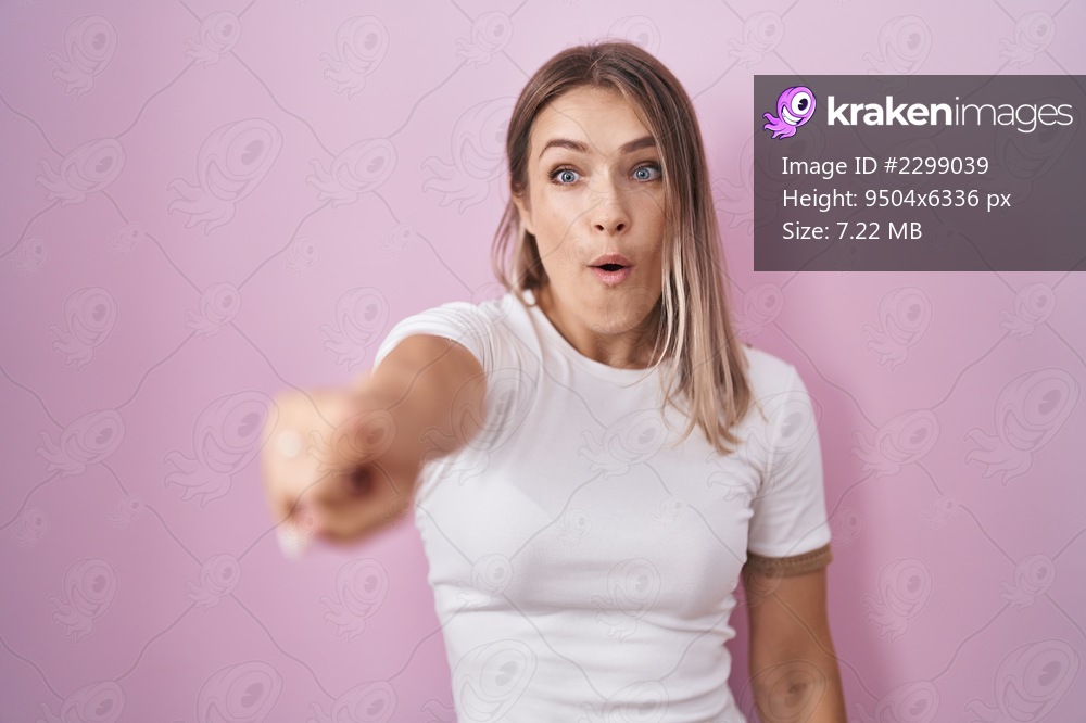 Blonde caucasian woman standing over pink background pointing with finger surprised ahead, open mouth amazed expression, something on the front