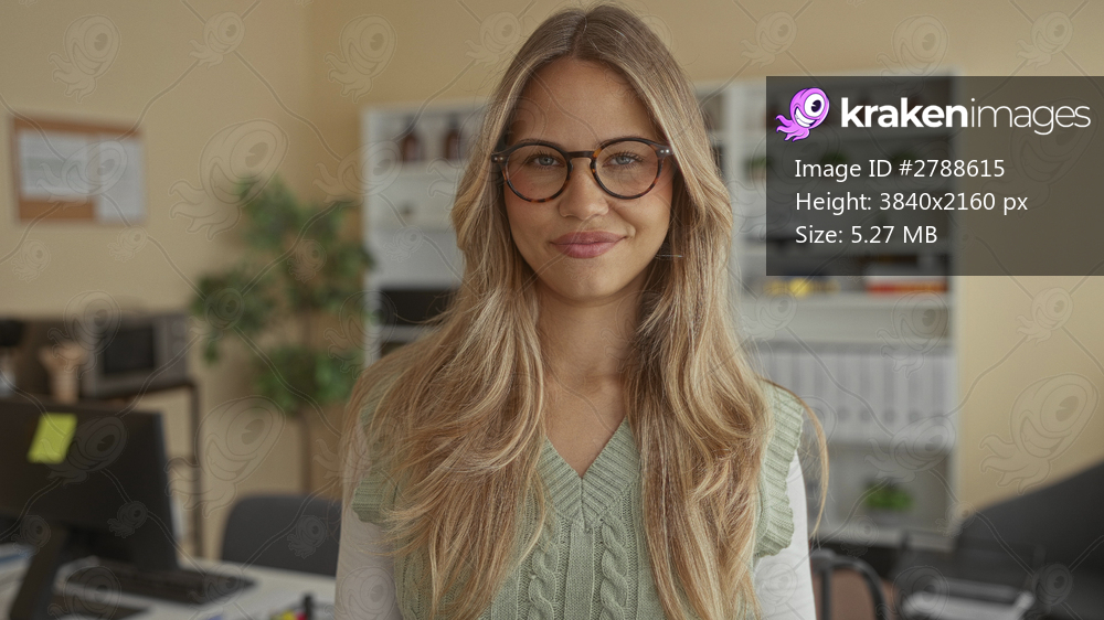 Blonde caucasian woman wearing glasses closes eyes and smiles softly in office; calm mindfulness serenity.