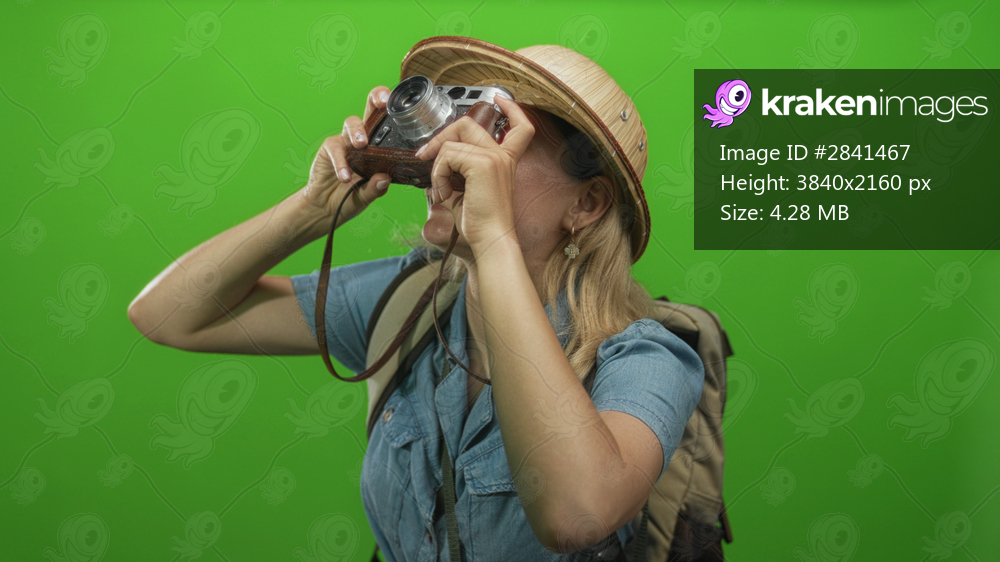 Blonde explorer woman in straw hat raising camera with both hands and gripping backpack strap in studio; curiosity.