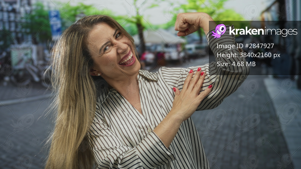Blonde middle age woman flexes bare arms on busy urban street during daylight; confidence empowerment strength.