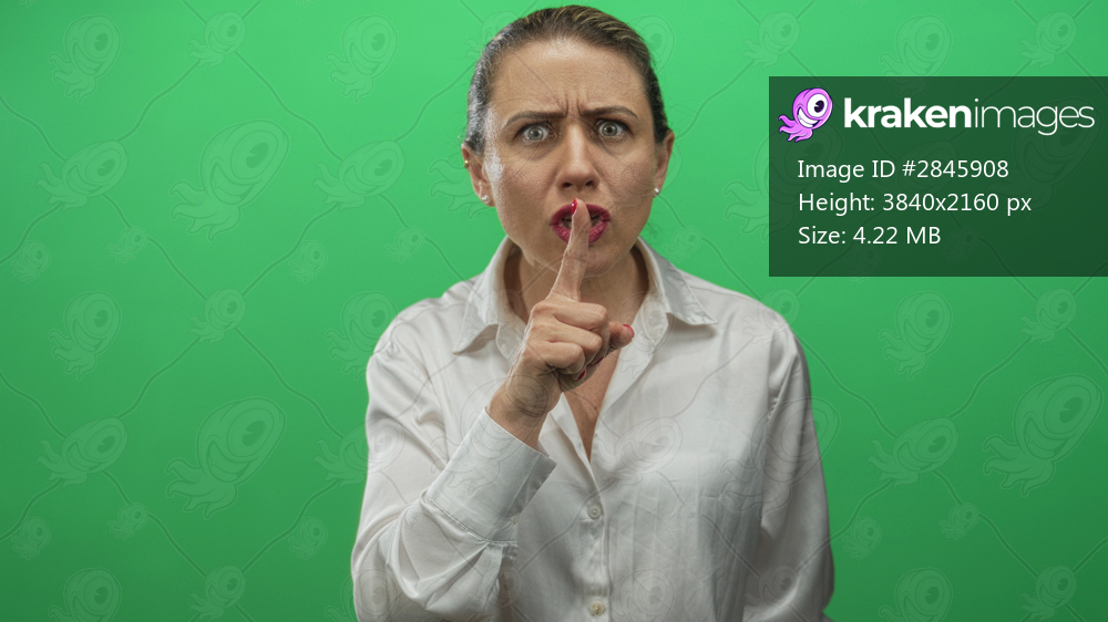 Blonde middle age woman wearing white shirt pressing a finger to her lips for silence in a green studio scene; silence.
