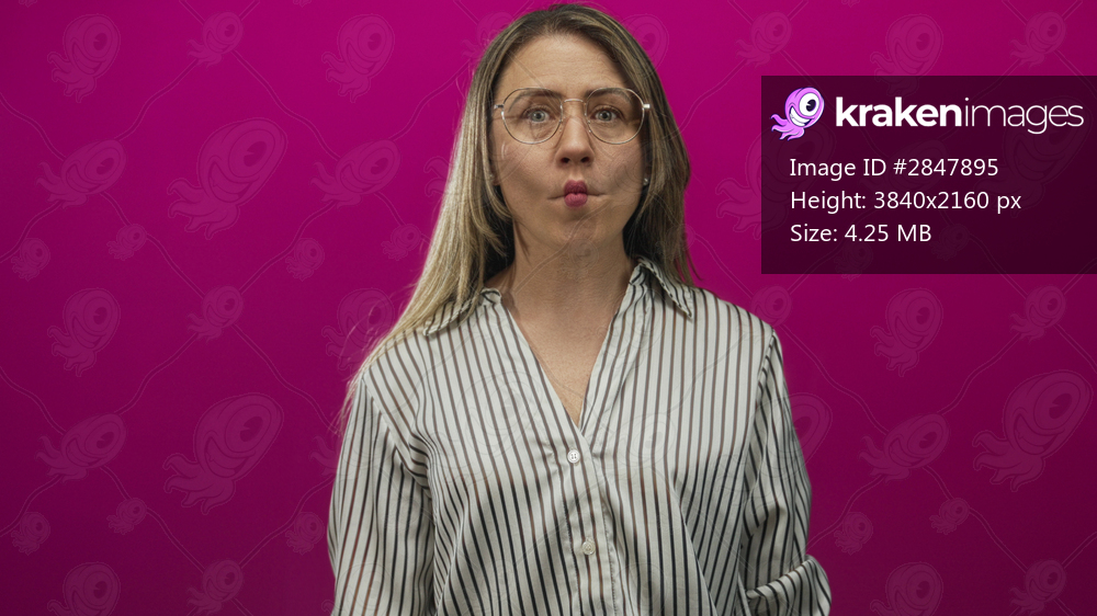 Blonde middle aged woman in striped shirt wearing glasses lips puckered thoughtful gesture in studio; curiosity.