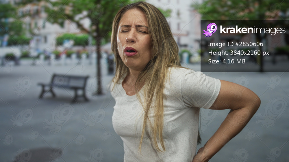 Blonde middle aged woman in white tshirt clutching lower back with one hand and closing eyes on street; pain.