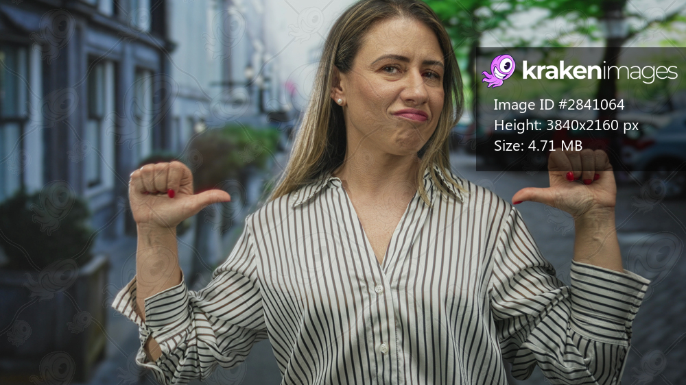 Blonde middle aged woman pointing both thumbs to chest on a sunny city street with green trees and parked cars; confidence.