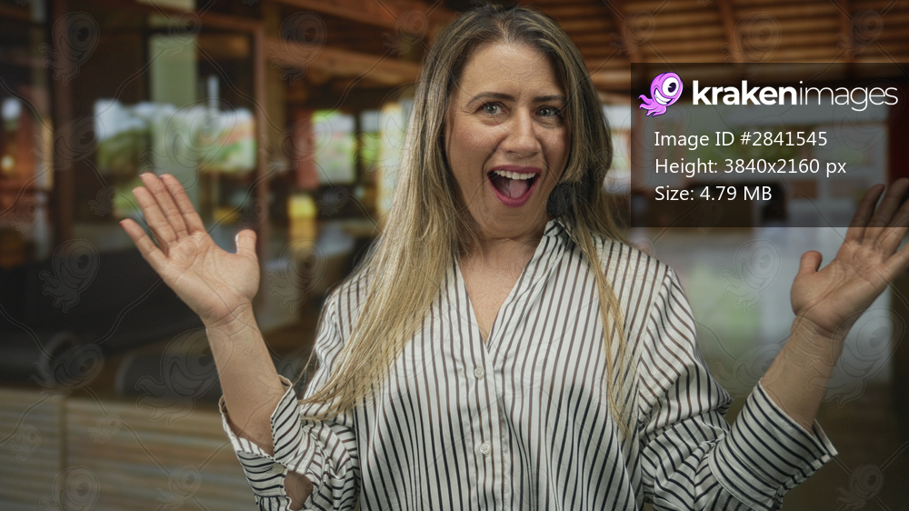 Blonde middle aged woman raises open palms and smiles widely in a brown wooden building interior; excitement.
