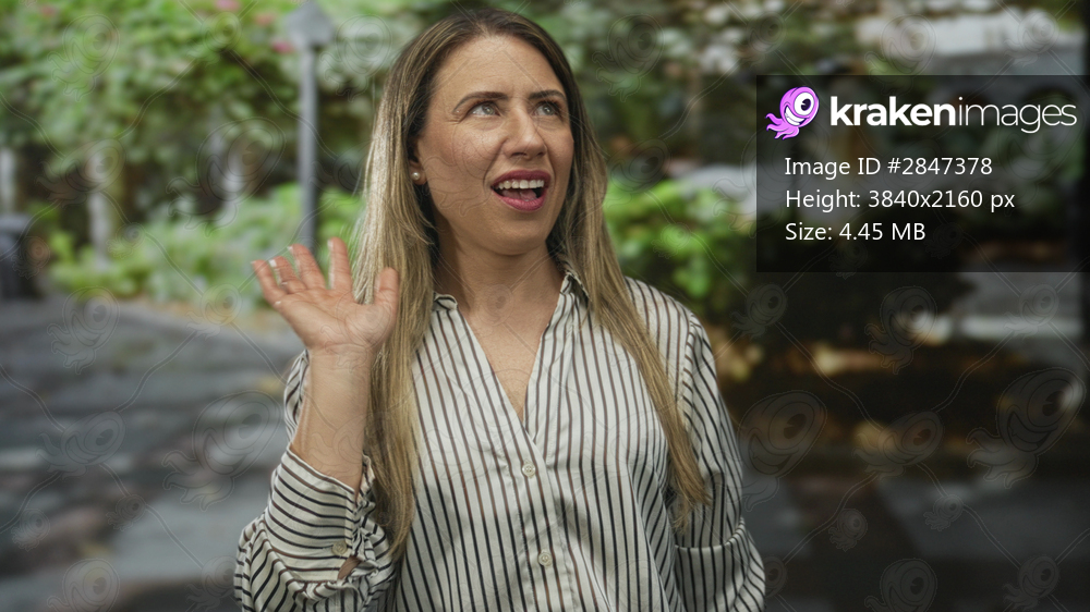 Blonde middle aged woman smiling and waving hand on street with green foliage and building facade behind; greeting happiness.