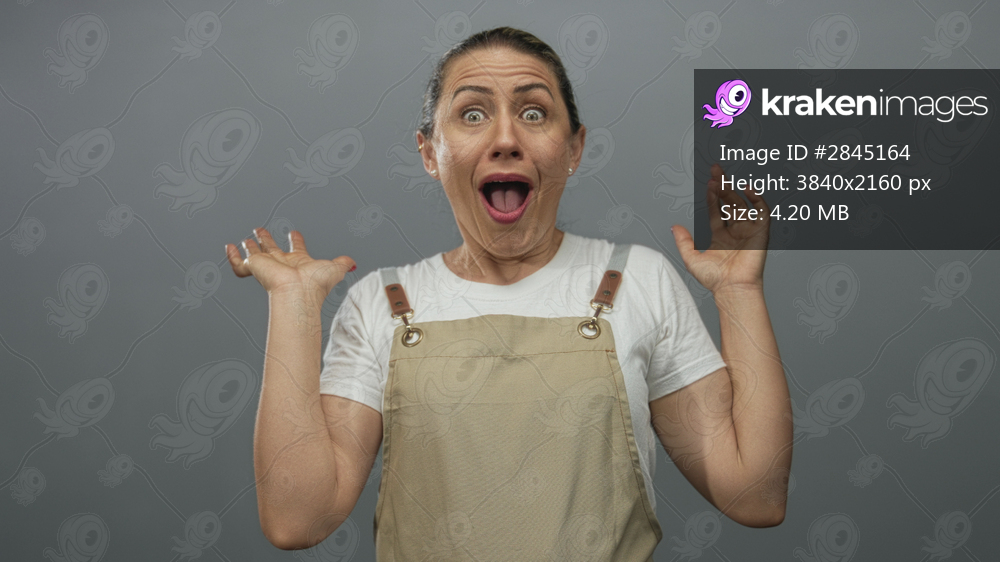 Blonde middle aged woman wearing beige overalls raises hands near her face against a grey studio backdrop; surprise.