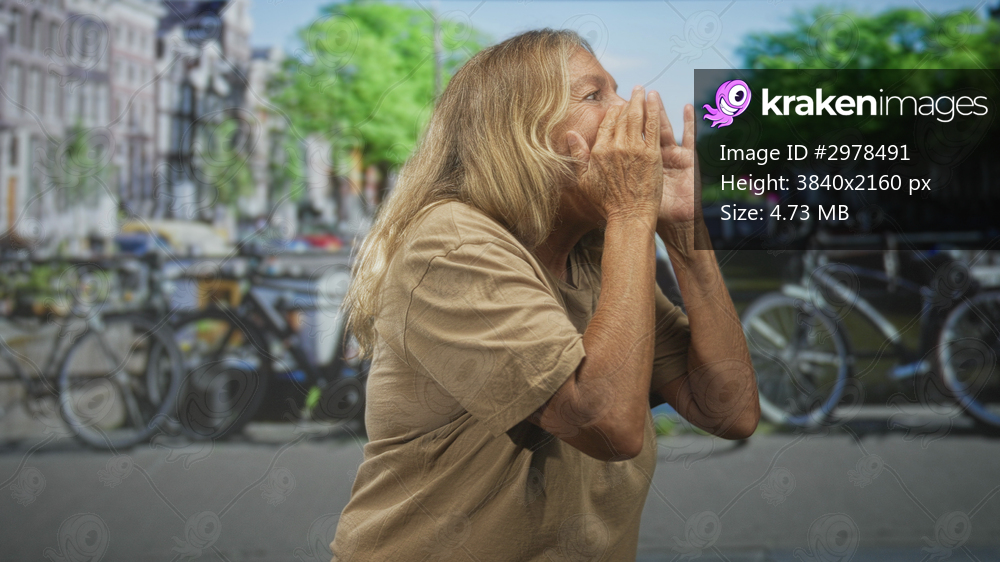 Blonde senior woman cups hands around mouth, shouting toward parked bicycles along a canal-lined city street; calling out joy.