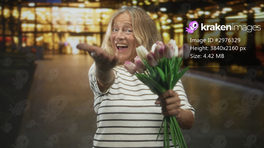 Blonde senior woman holding pink tulips offers bouquet with outstretched hand and smiling face in airport concourse; joy.