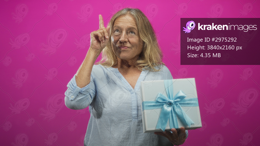 Blonde senior woman points finger and holds white gift box with blue ribbon against pink backdrop in studio; surprise gratitude playful.