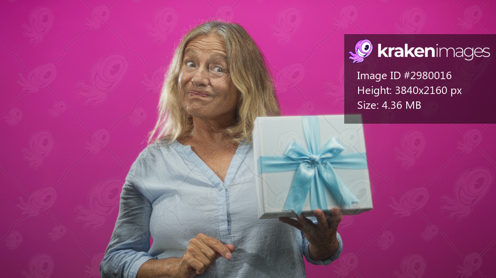 Blonde senior woman points finger and holds white gift box with blue ribbon against pink backdrop in studio; surprise gratitude playful.