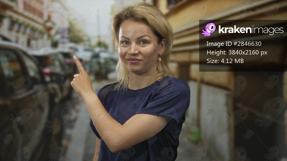 Blonde smiling woman standing and pointing finger to ornate facade on cobblestone street; curiosity exploration discovery.