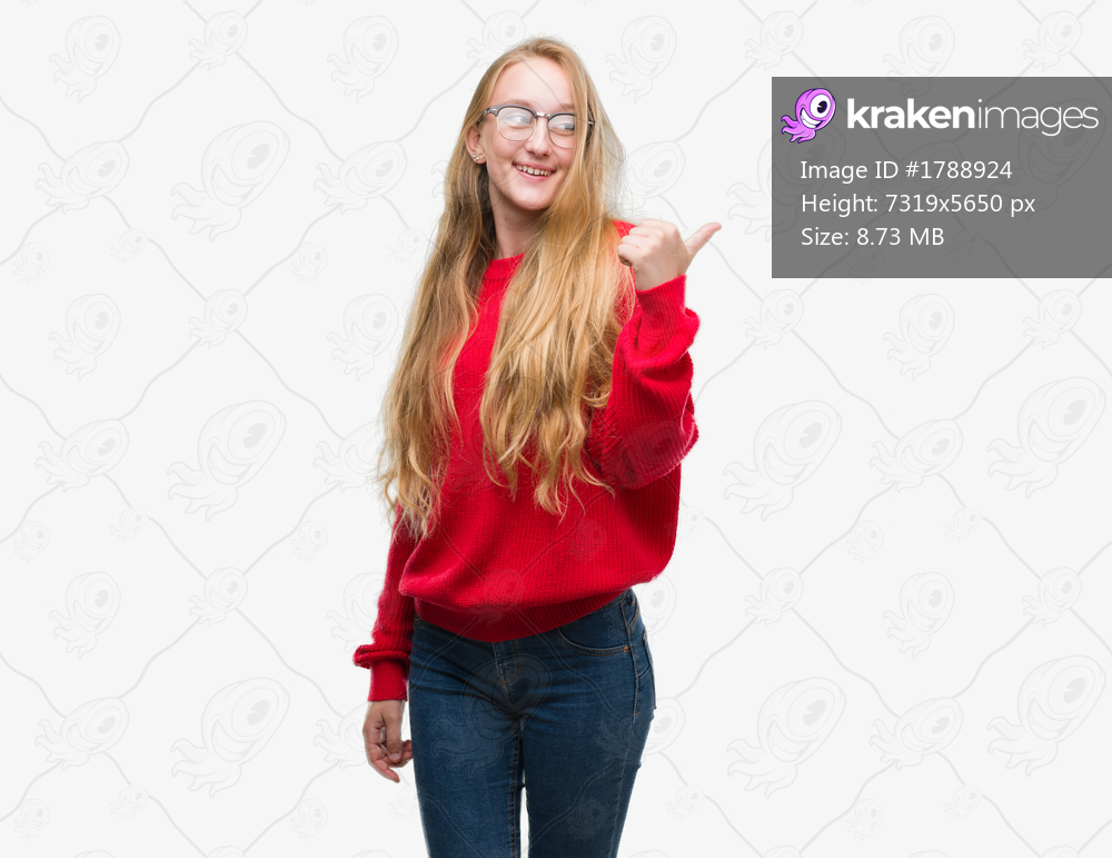 Blonde teenager woman wearing red sweater smiling with happy face looking and pointing to the side with thumb up.