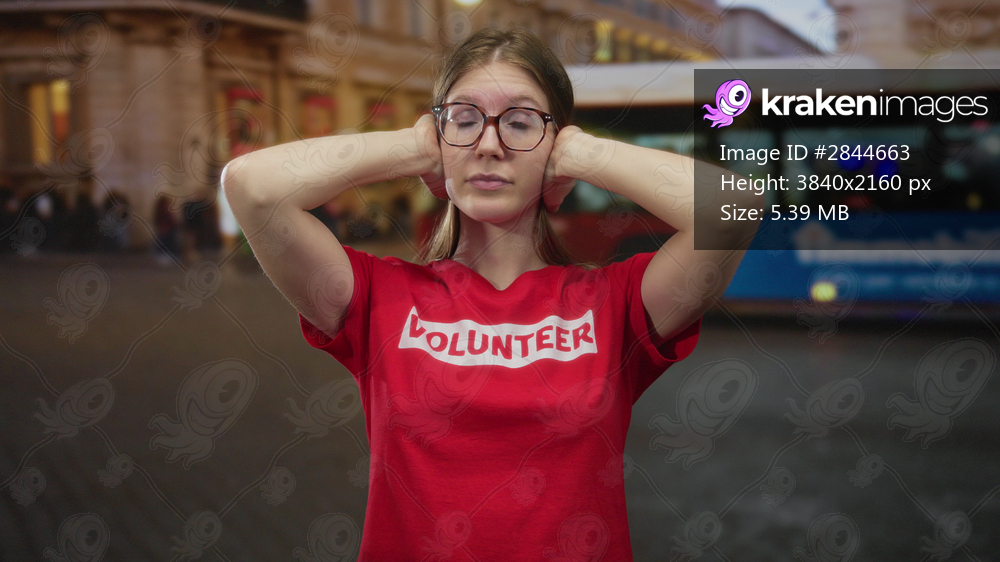 Blonde volunteer woman covers ears with hands on busy city street at night amid neon lights; stress noise overload tension.