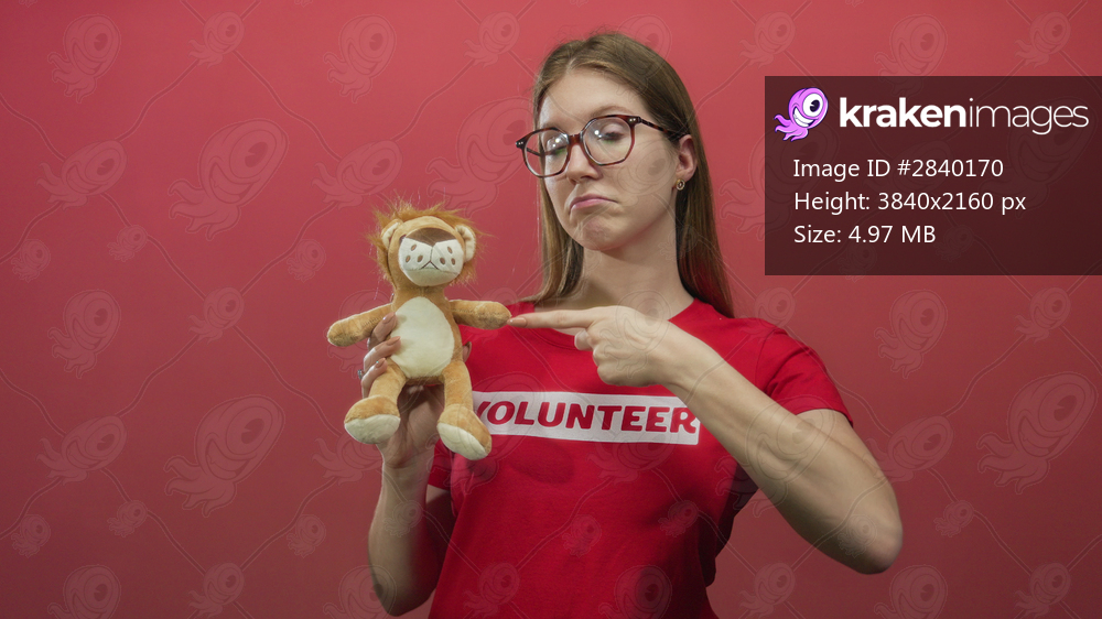 Blonde volunteer woman with glasses pointing finger to stuffed lion toy while holding it in red studio; compassion.