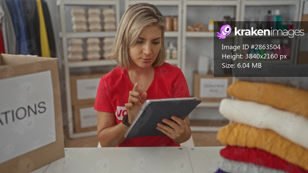 Blonde volunteer woman holds tablet and taps screen in donation center building; generosity solidarity support.