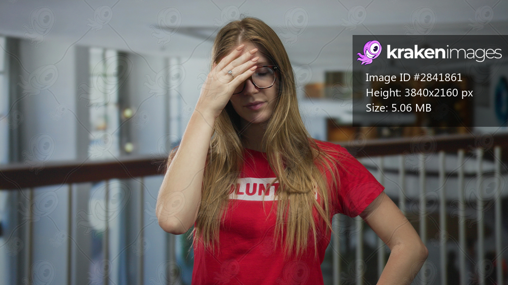 Blonde volunteer woman in red shirt wearing glasses with hand on forehead in a hotel lobby; stress.