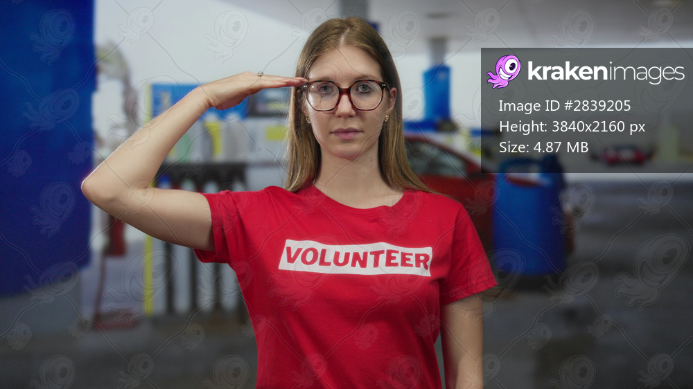 Blonde volunteer woman salutes with hand to forehead by petrol station building in broad daylight; dedication service.