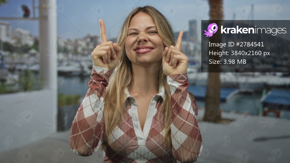 Blonde woman with a cheerful smile points both index fingers upward at marina dock; anticipation optimism.