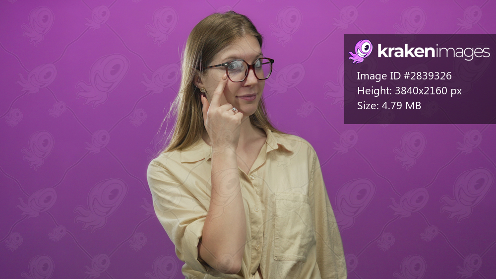 Blonde woman adjusting round glasses with slight smile by pointing finger to lens in purple studio setting; contemplation.