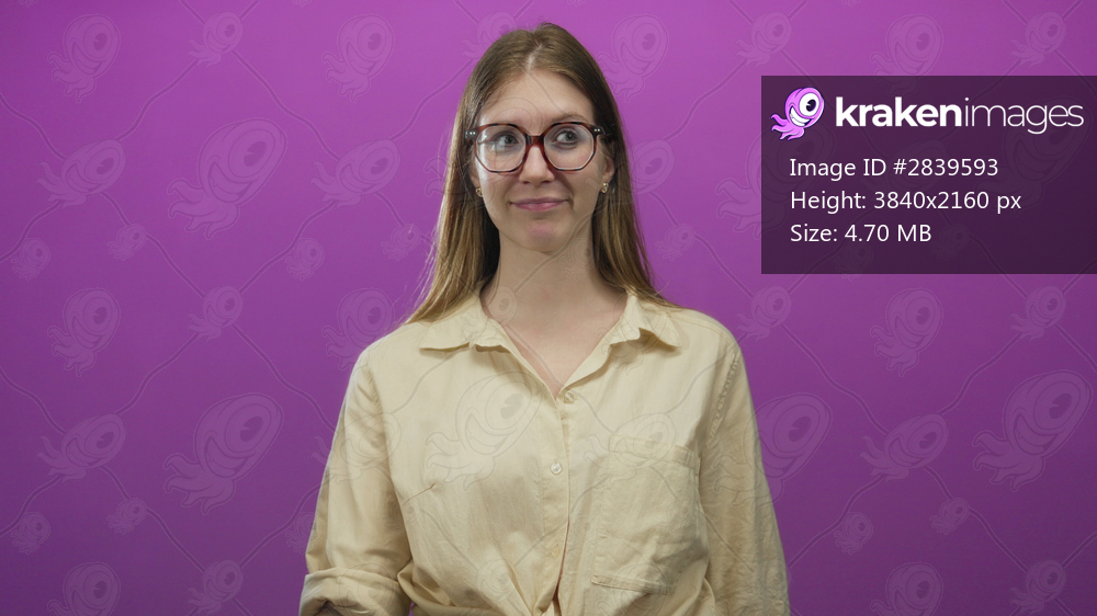 Blonde woman adjusting round glasses with slight smile by pointing finger to lens in purple studio setting; contemplation.