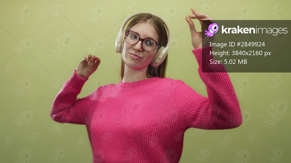 Blonde woman adjusts beige headphones on her head in a pale green studio with closed eyes; serenity.