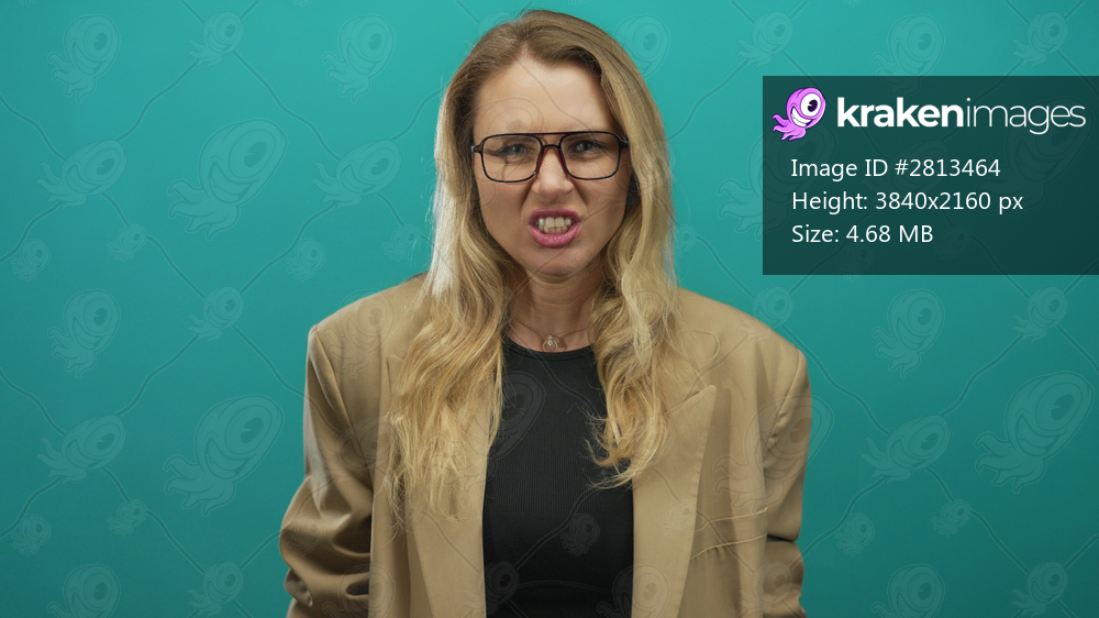 Blonde woman angrily gesturing with fists over isolated green background wearing glasses and suit, conveying emotion and conflict with intense expression and dynamic body language. - Kraken Images