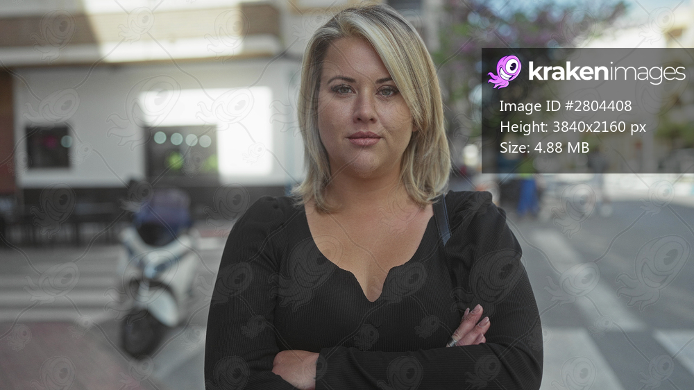Blonde woman with arms crossed by a zebra crossing on a busy city street in bright daylight; confidence.