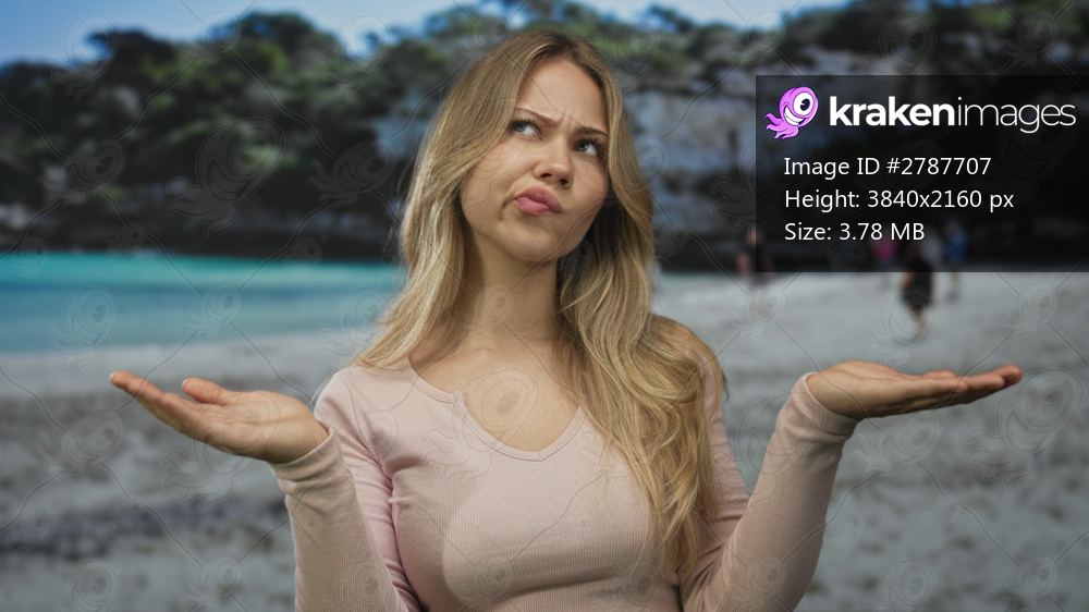 Blonde woman with bare arms and palms raised in questioning gesture at sandy beach; confusion uncertainty.