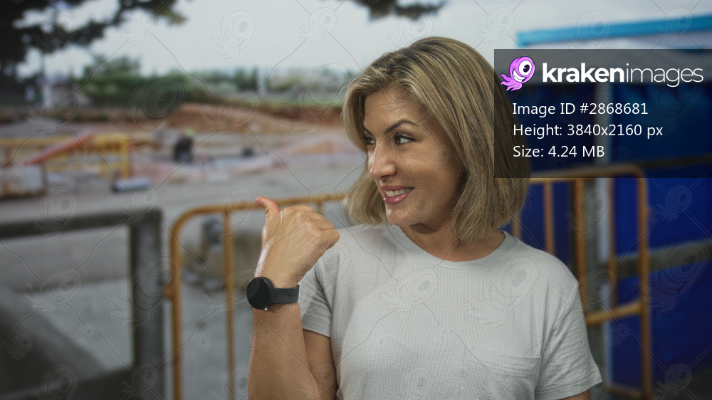 Blonde woman with bob haircut looks sideways, smiles and shows thumbsup at building site in daylight; optimism.