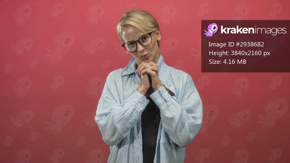 Blonde woman with clasped hands and glasses smiling in studio against a pink wall; gentle gratitude.