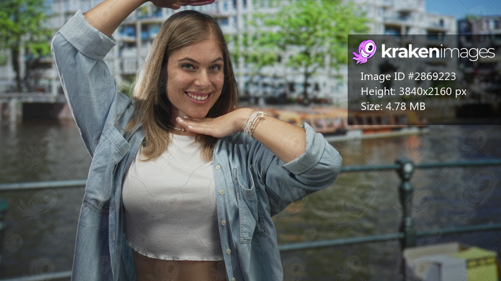 Blonde woman confidently frames face with hands and smiles showing midriff on sunlit street by canal; joy.