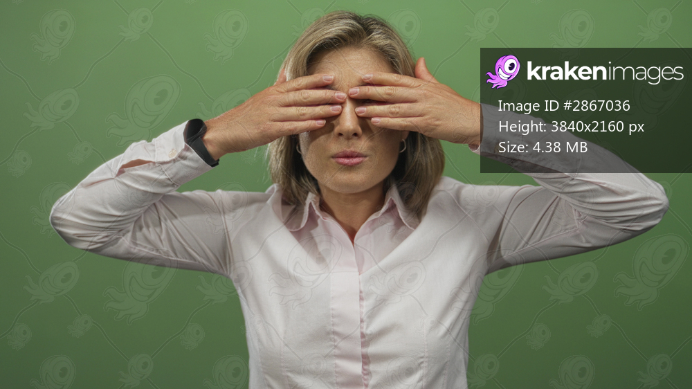 Blonde woman covers eyes with hands then uncovers them to show surprised face in green studio; surprise playfulness.